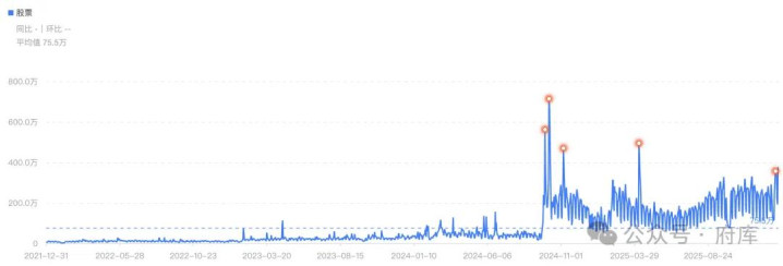 再看一下股票就更明显了,从2022年到2024年9月份之前,股票的热度一直都非常低迷,但是2024年9月底的行情,直接把股票的关注度拉了起来,从那以后股票的关注度就有了大幅提升,而且一直是保持这个状态的。